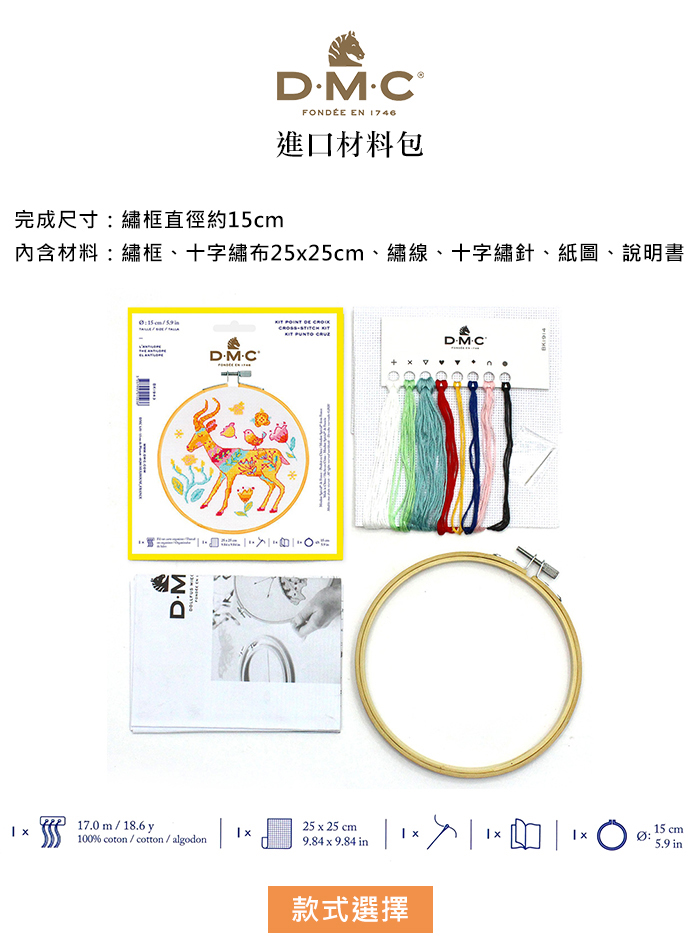 繡框、十字繡布25x25cm、繡線、十字繡針、紙圖、說明書