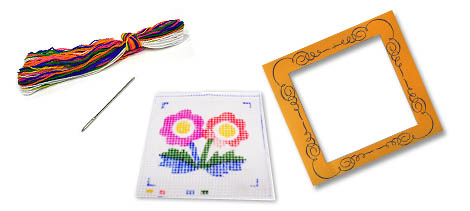 紙相框、彩圖十字布、壓克力棉線、十字繡鈍針、說明書