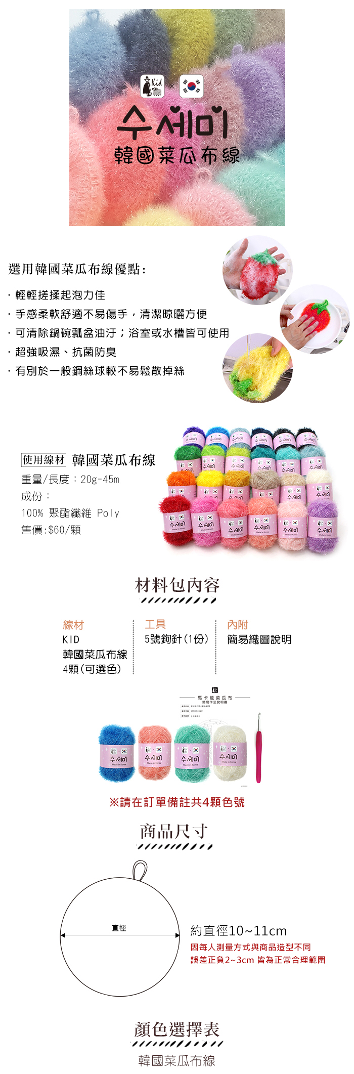 KID-韓國菜瓜布線4顆(可選色)
